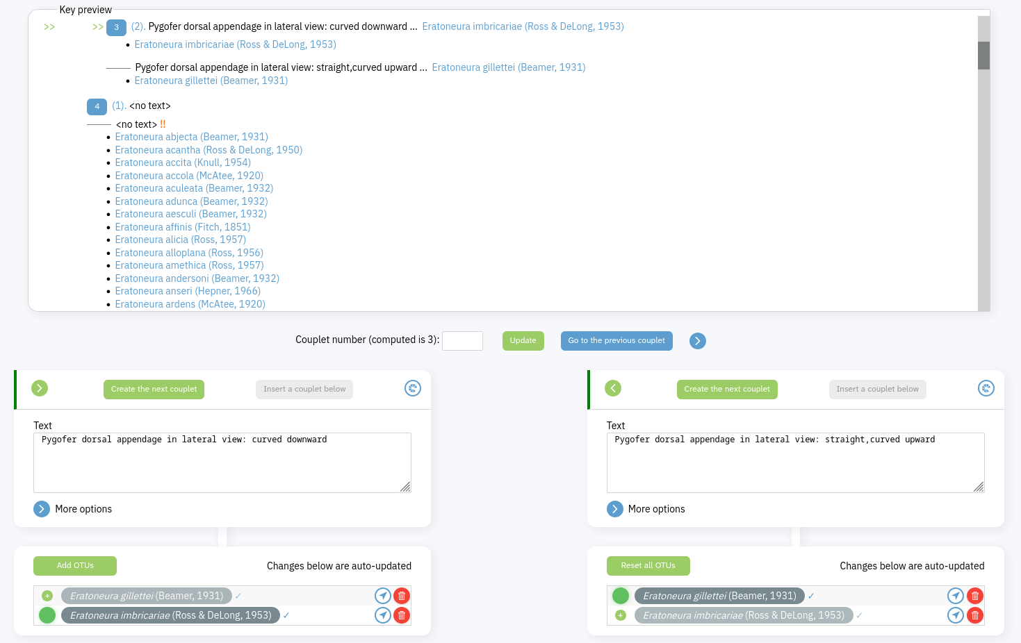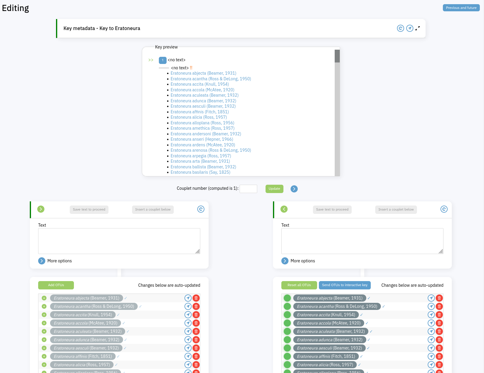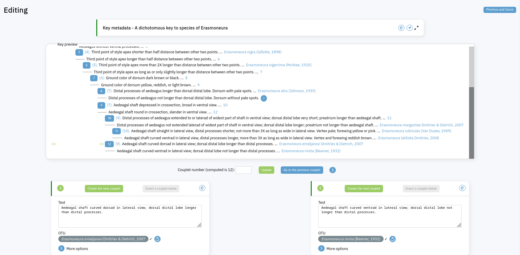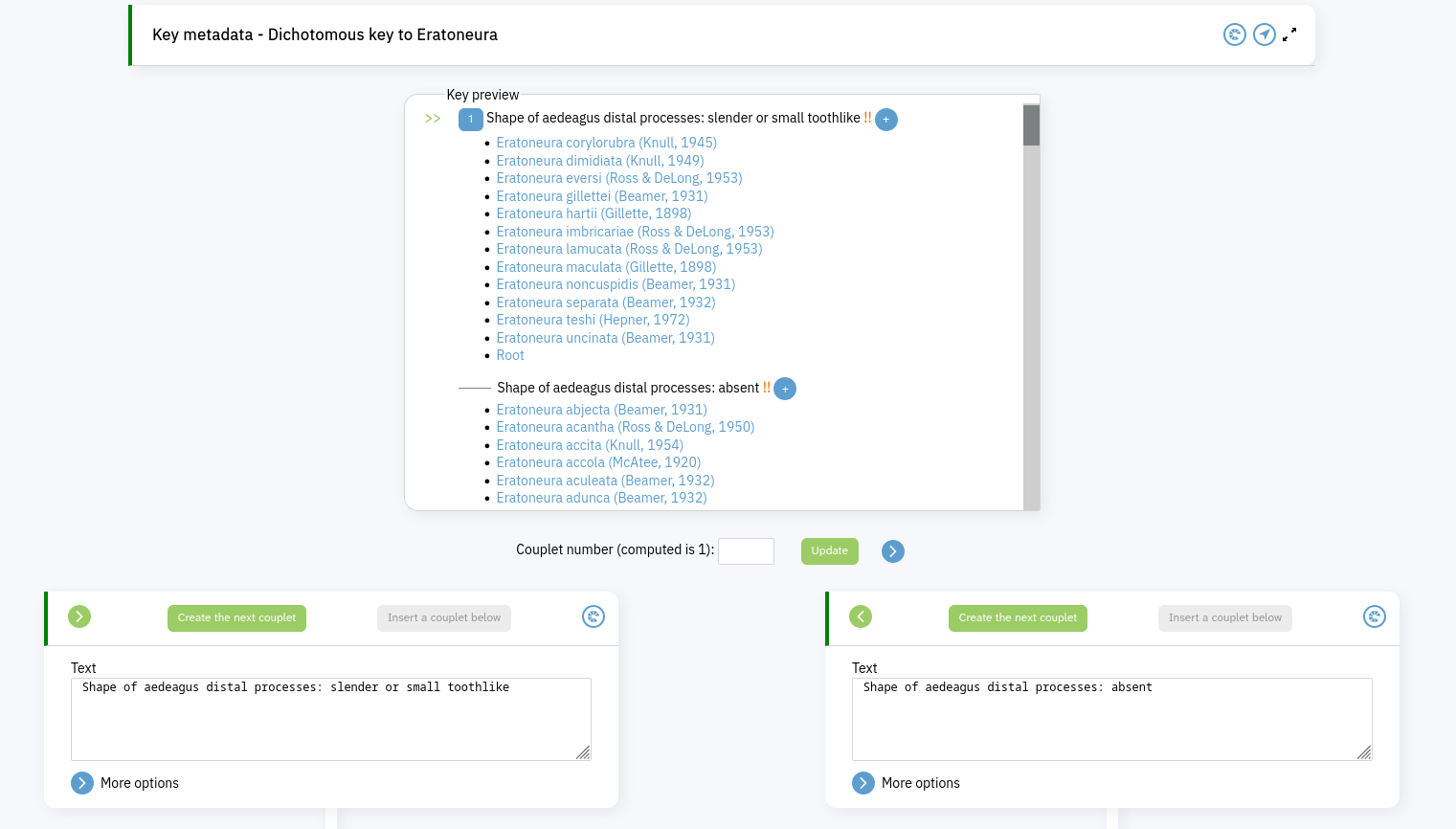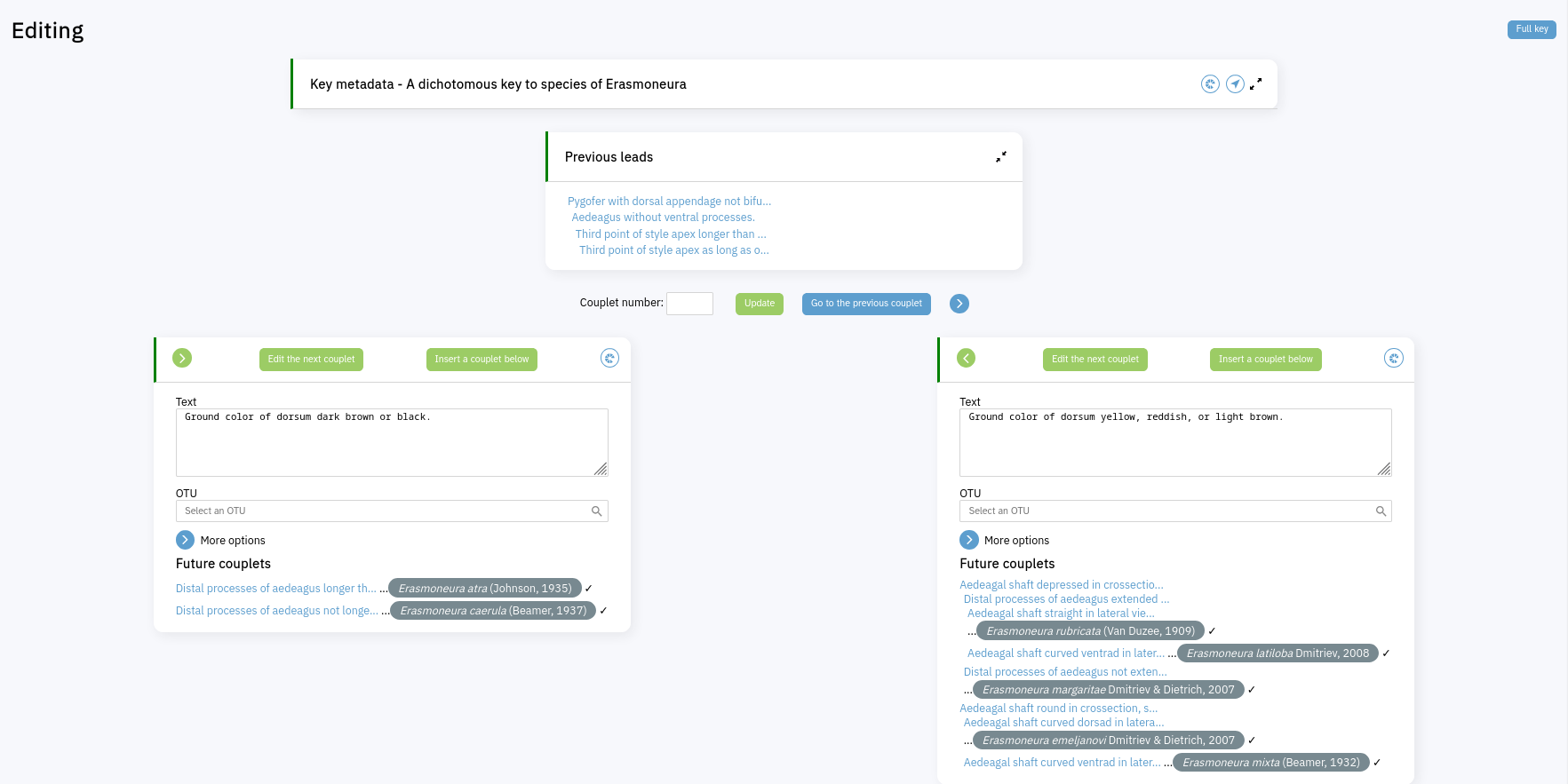 Full key view of a standard keyIn this view the Key preview section shows your key in the way it might typically appear in print. The pair of green arrows points to the couplet you're currently viewing. Click on a numbered blue button to load that couplet for viewing/editing; clicking on numbers that aren't buttons navigates within the key within loading a new couplet. Click on the blue circle with a plus inside it in the second lead of couplet 8 to create a new couplet below it - leads that have already been assigned an OTU don't show this button, so you can tell at a glance which terminal leads have not yet been assigned an OTU.