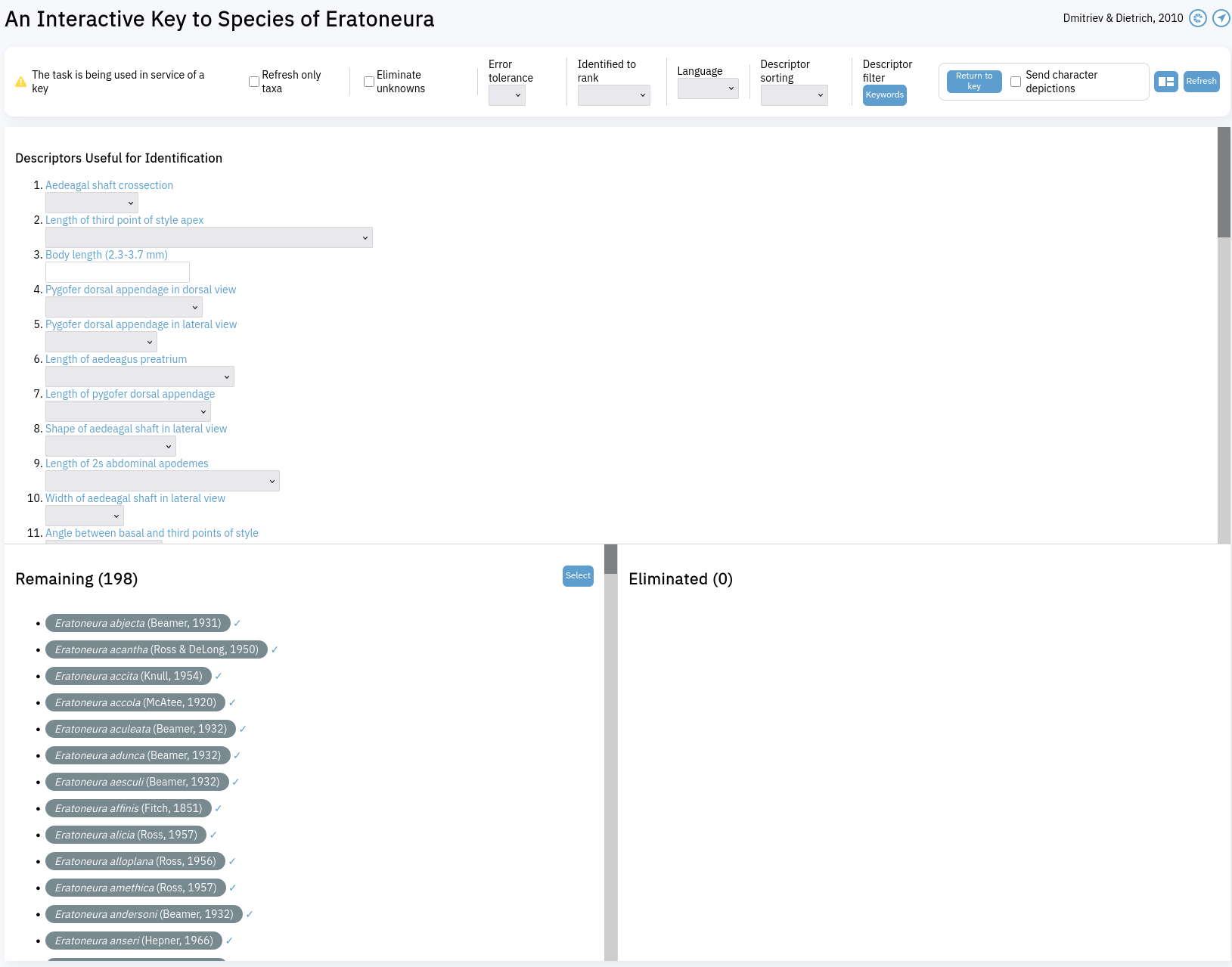 As an example we'll retrace the beginning steps of a case where the work has already been done: the leafhopper genus Eratoneura. The interactive key has 198 OTUs and 40 descriptors; the resulting dichotomous key has 199 couplets.