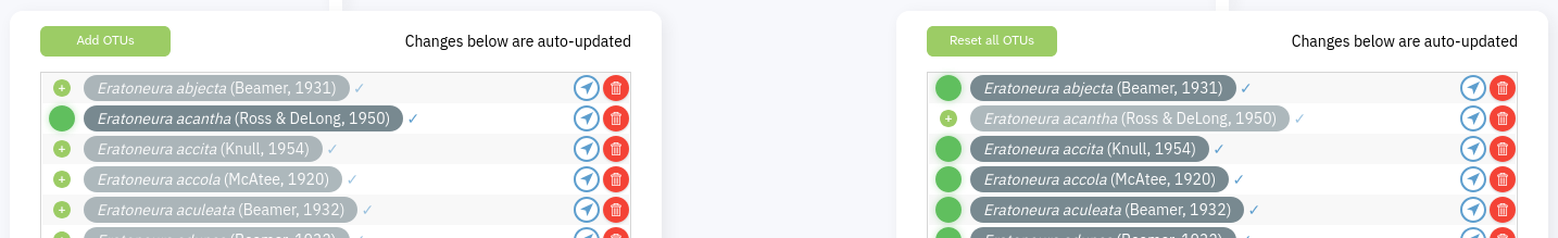 - a bright green large circle and a full-color OTU name indicate an OTU is assigned to that lead (as on the right here). Click the smaller TaxonWorks-standard green circle with the plus sign in it (on the left here) to move an OTU to the lead you clicked on - note that that will remove that OTU from the other lead. Here for example we've clicked the add button on the second OTU on the left: