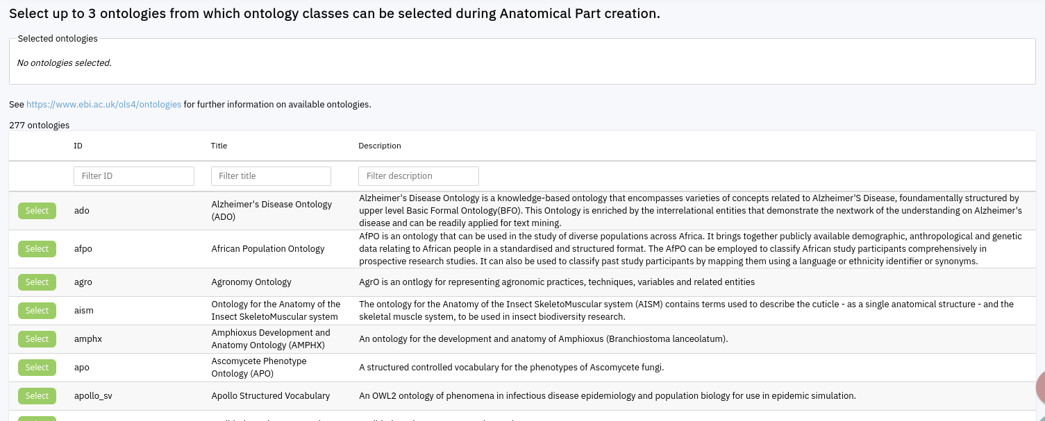 When creating Anatomical Parts, users can search up to three ontologies for terms describing their specific part. The ontologies available for searching are those listed at https://www.ebi.ac.uk/ols4/ontologies.