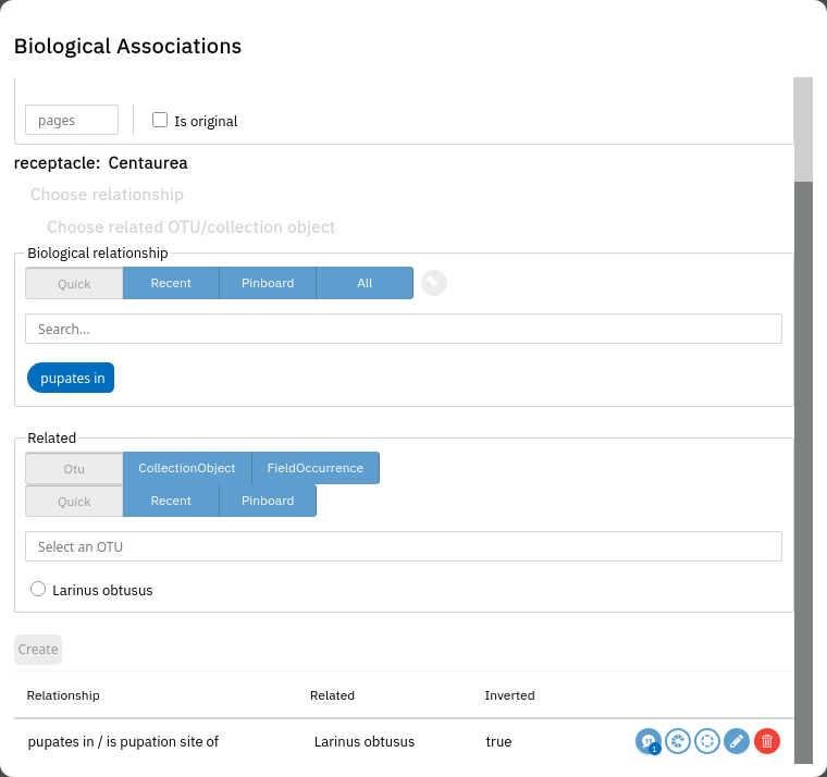 The relationship is 'pupates in/is pupation site of' - we can search on either description, but the form will always load with 'pupates in' coming first. In this case the direction of the form is 'receptacle of Centaurea' first, so we just need to click 'flip' on the relationship so that it starts with 'is pupation site of'. To finish the form and auto-create the relationship we'll search for the OTU Larinus obtusus as the object of the relationship: