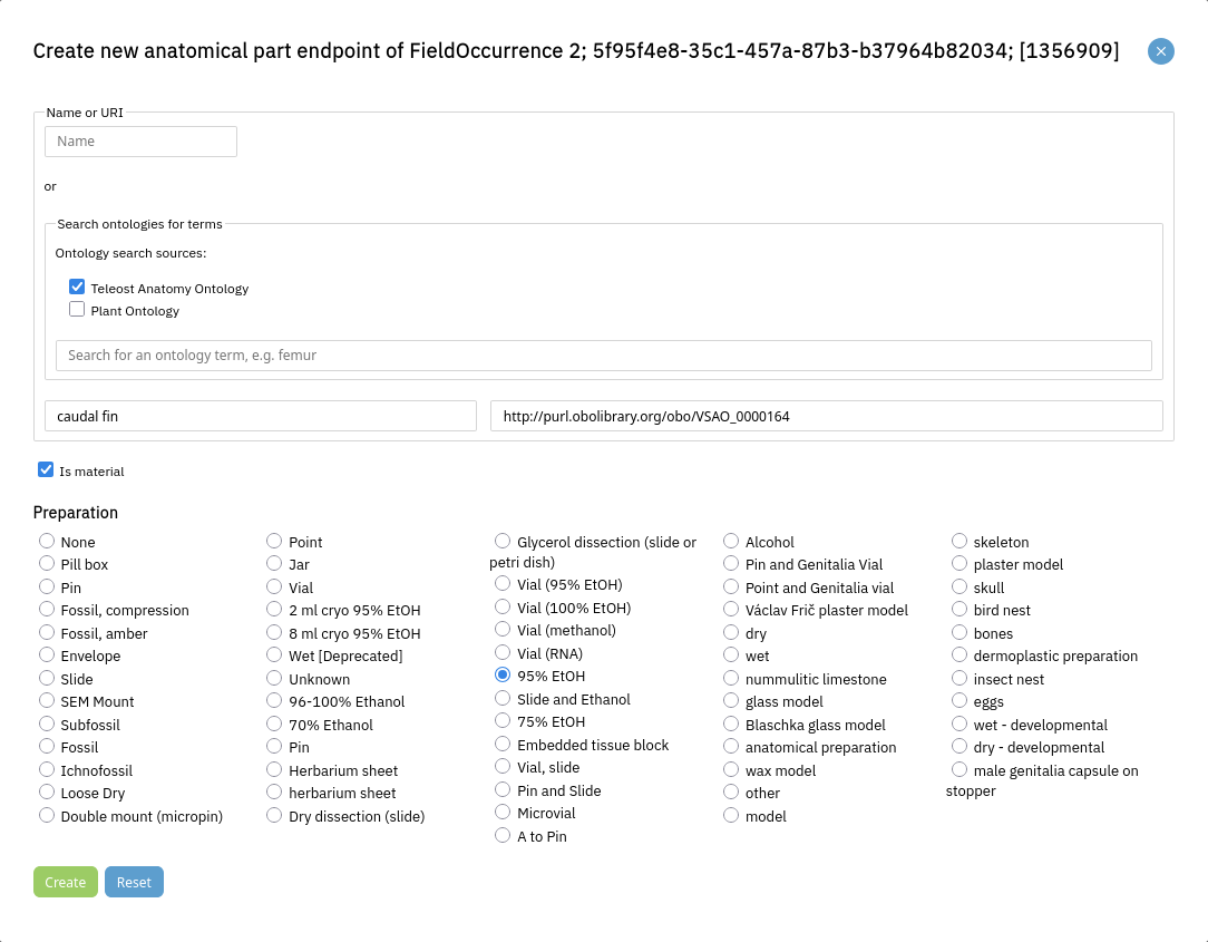 In the screenshot below we've searched the Teleost Anatomy Ontology for 'caudal fin' and selected the first exact match. We've also selected '95% EtOH' as the preparation type, and checked the 'Is material' box since our fin is in this case 'material' even though it came from a Field Occurrence (the ambiguous Field Occurrence case should be the only time you need to check that box yourself):