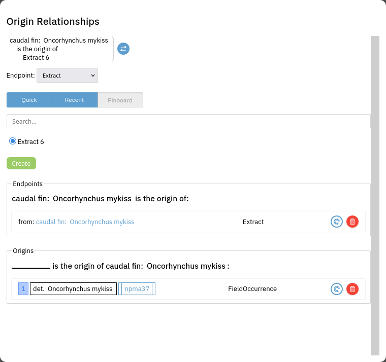 Read from the top down: "our fin/is the origin of/_____", so select Extract as the endpoint type, select the already-created Extract from the smart selector (here I had the Extract on my pinboard), and click Create. Your screen should now look like